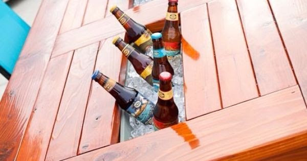 DIY Wood Patio Table w/Built in Beer/Wine Cooler. Would also be cute as a craft or office table, you could put supplies in the middle. A pretty dining table with flowers in the middle, etc.